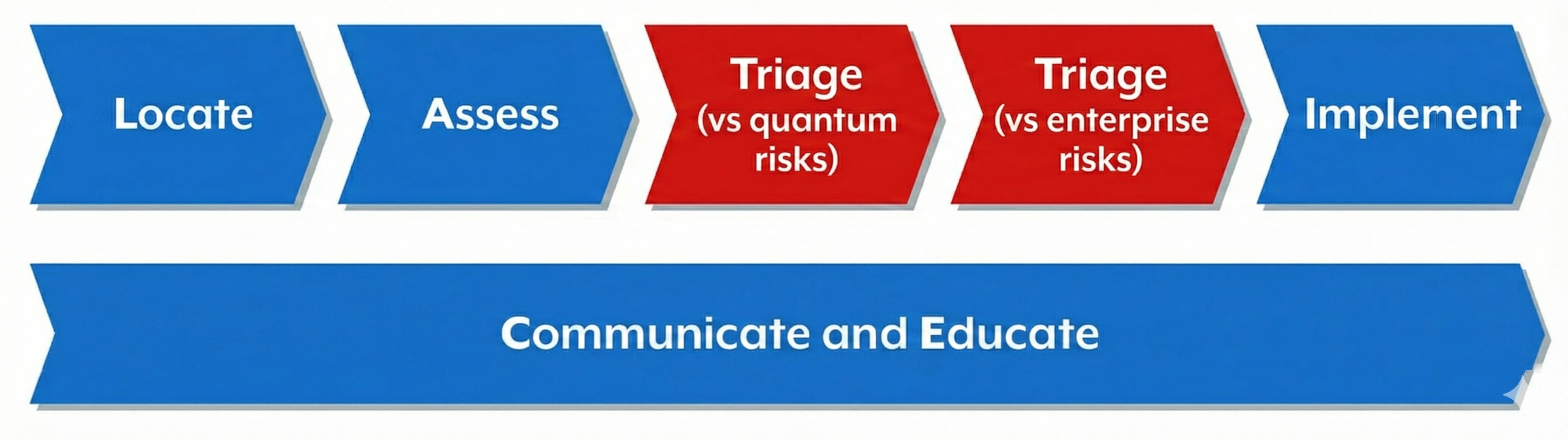 The right way to go about tackling this problem is actually cybersecurity risk management 101 - you need to understand and assess your risks, prioritise mitigation actions and implement them. Various frameworks have been suggested around this general approach. Here in Australia, the ACSC have proposed a framework of four steps - Locate, Assess, Triage, and Implement, supplemented by ongoing Communication and Education throughout these activities. If you squint, you might see that this can be represented by the acronym LATICE - presumably someone in ACSC has ignored spelling and is making a humorous reference to the fact that the main recommended PQC algorithms are based on something called “lattice-based cryptography” …