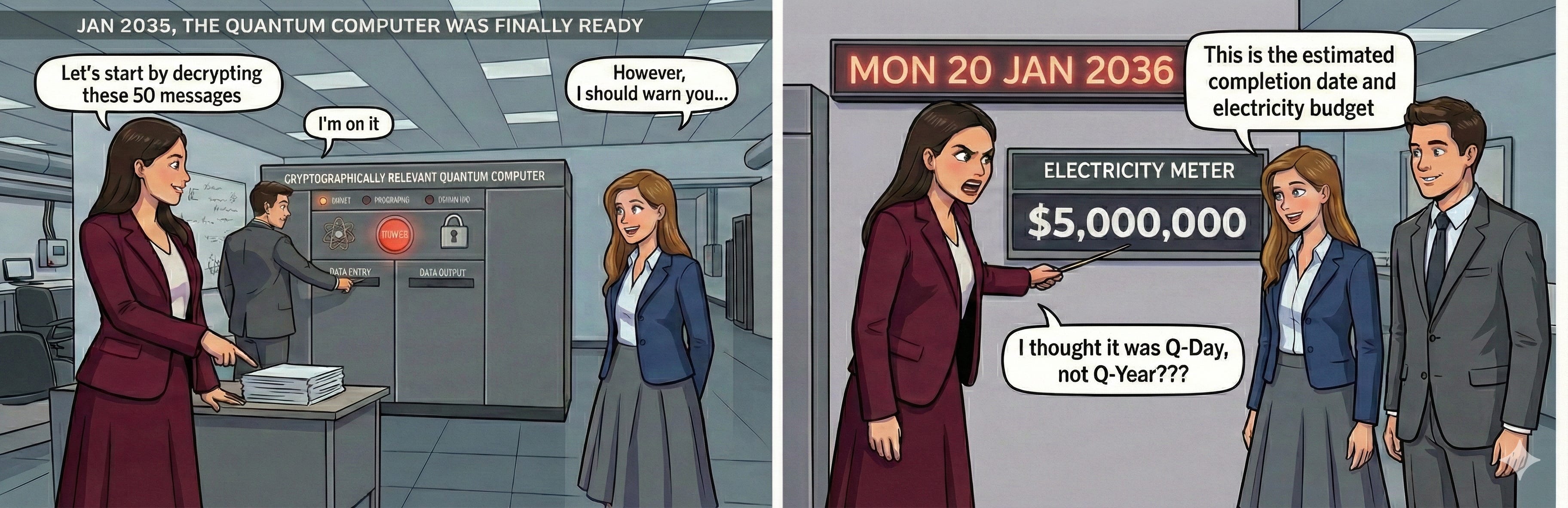 Another common theme in some of the dramatic narratives is the concept of “Q-Day” - some mythical day when a quantum computer comes along, and suddenly every bad actor can see everyone else’s data. Even if we remember myth 1 and narrow this to every attacker being able to see everything sent across the internet, it’s still just not true. The first quantum computers that can threaten modern encryption, such as RSA 2048, will be very big and very rare. They will also be very expensive, not only to build but also to run. The electricity cost to recover a single session key for a single captured session will probably be over $100,000, and it will take about a week to run1. So anyone who has one of these devices will be very selective about what they use it for.