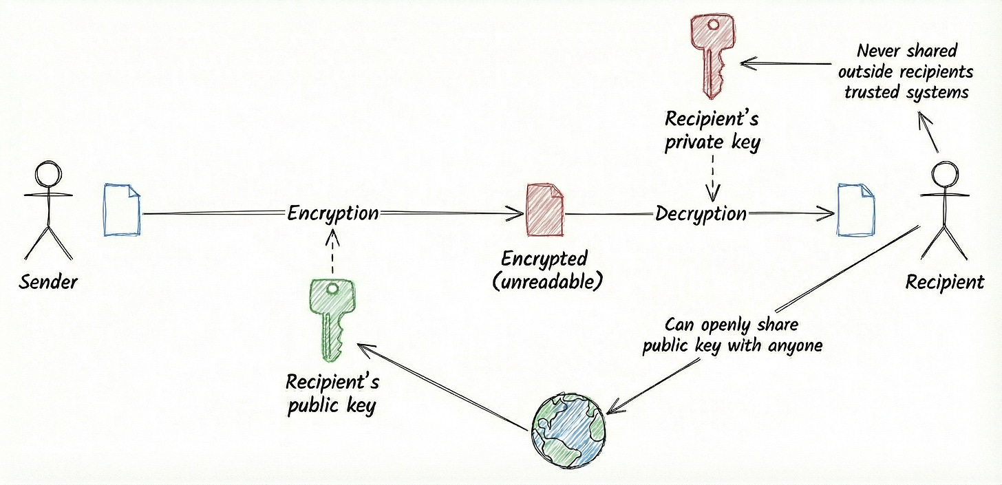 With the advent of the internet, and the desire to communicate with parties all over the world that we’ve never met in person, a different solution is needed. This is known as “asymmetric encryption”, or “public key cryptography”. It requires a special scheme that allows two different keys to be used - a public key that can be shared with anyone, and a private key that is just kept by one person and never shared. Data sent across the network that is intended for this person can be kept private from other prying eyes. This is by using a scheme that encrypts the message with the public key, but can only be decrypted using the private key - so no-one other than the private key holder can view the data being sent.